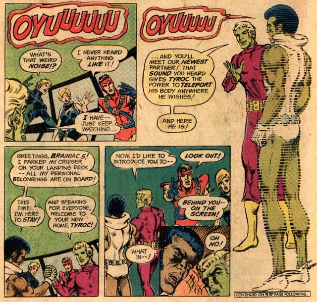 Absorbency Boy/Zoraz challenges Tyroc to a battle for Legion membership (one hopes the Legion would still reject AB if he won…). Tyroc blasts him with a pitch only Superboy can hear. The inexperienced Absorbency Boy reels at the painful sound and Tyroc knocks him out. Later that day, Tyroc is sworn in as the newest member of the Legion of Superheroes. Presumably Absorbency Boy goes back to testing paper towels. Not quite – they turned him into Earth Man, one of the Legions deadliest villains and eventually joining the Legion. He died in the Legion’s last pre-New 52 book as heroically as this modern comic age allows…